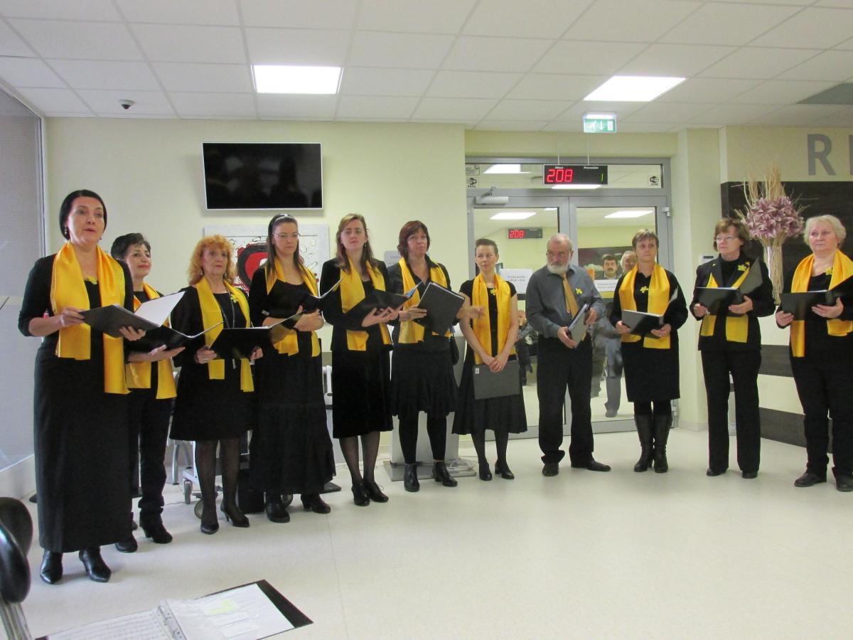 Piesne Speváckeho zboru Ligy proti rakovine Nádej pomohli onkologickým pacientom zabudnúť na chvíľu na svoje ťažkosti. Nádherné slovenské, ale i svetové koledy zaspieval zbor zložený z onkologických pacientok bývalých, súčasných, ale i zdravých ľudí, ktorí tým chorým vlievajú svojím spevom nádej. Ako zbormajsterka sa predstavila asistentka hygieny NOÚ Monika Sáričková, ktorú dnes prvýkrát mnoho kolegov videlo aj v inej polohe, ako pracovnej so zeleným kufríkom v ruke.