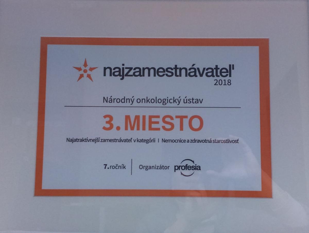 Národný onkologický ústav sa v hodnotení vyše 13 tisíc hlasujúcich Slovákov umiestnil v kategórii Nemocnice a zdravotná starostlivosť na treťom mieste. Respondenti pri hlasovaní považovali pri výbere naj zamestnávateľa za najdôležitejšie: silnú a známu značku, dobré meno spoločnosti, platové ohodnotenie a benefity zamestnancov, kvalitné služby či produkty a pracovný kolektív.