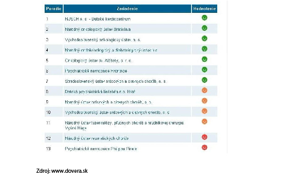 Prieskum realizovala poisťovňa Dôvera a hospitalizovaní pacienti v ňom dostali možnosť ohodnotiť nemocničné zariadenie vyplnením a zaslaním dotazníka. Dospelých klientov sa pýtali na 12 otázok, rozčlenených na spokojnosť so správaním lekárov a sestier, úrovňou ubytovania, stravy a hygieny a so zdravotnou starostlivosťou.