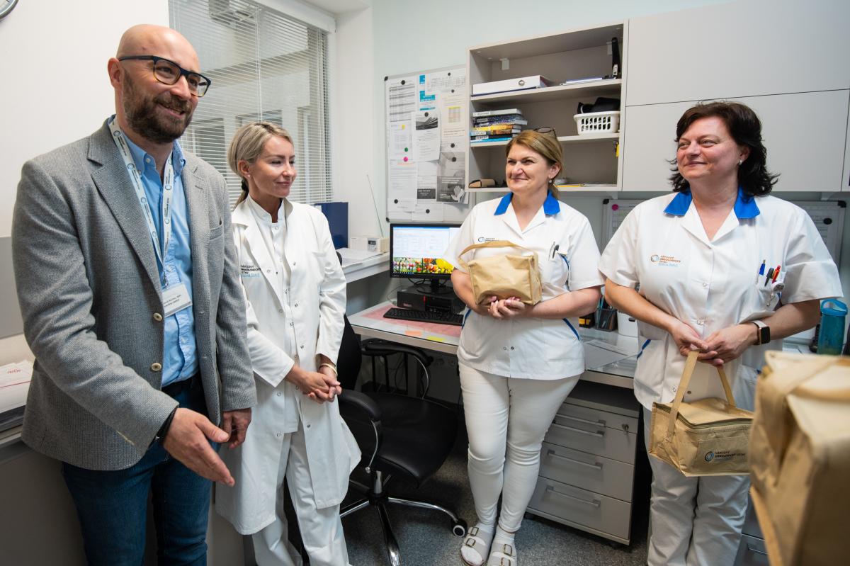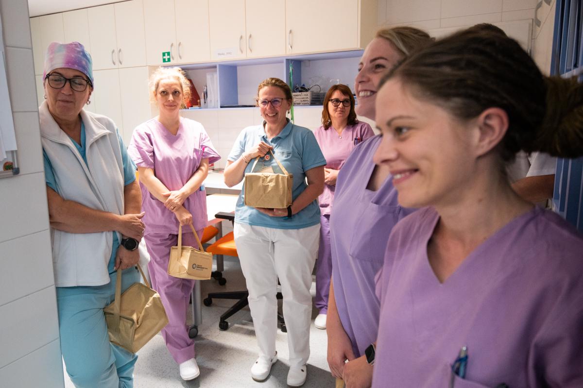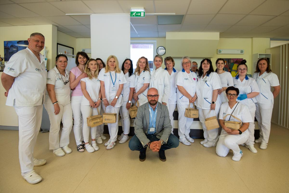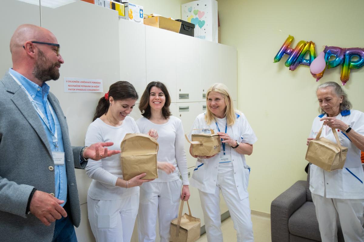 Ako každý rok, aj dnes navštevuje všetky oddelenia riaditeľ Ing. Tomáš Alscher, MPH spolu s PhDr. Katarínou Zanchettou, námestníčkou pre ošetrovateľstvo a MUDr. Jozefom Dolníkom PhD. MPH, námestníkom pre zdravotnú starostlivosť, aby spoločne vyjadrili podporu a slová vďaky našim 642 zdravotníckym zamestnancom. Poďakovali sa im aj maličkosťou. Sklenené dózy s termoobalom potešili – nielen ako praktický darček, ale najmä ako pripomienka, že si ich prácu vážime.
