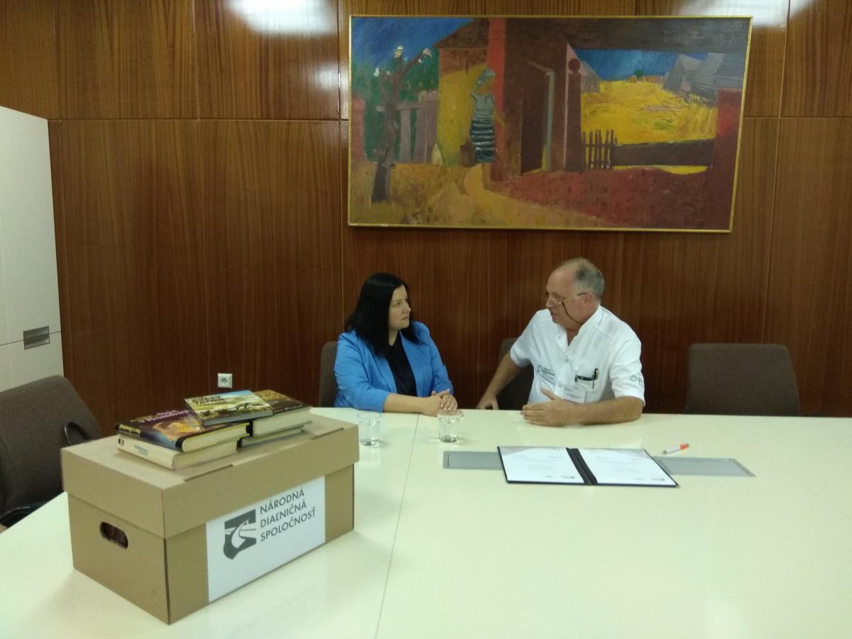 Knižky, ktoré podarovali zamestnanci NDS ako prejav solidarity s pacientmi nášho ústavu a ako prejav úcty k práci našich zamestnancov, osobne dnes prevzal od JUDr. Jany Jakabovej, riaditeľky Úseku podpory riadenia, NDS, prof. MUDr. Juraj Pechan, Csc. medicínsky riaditeľ NOÚ.